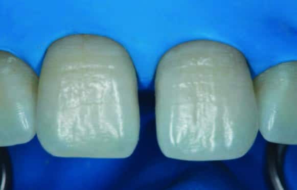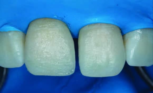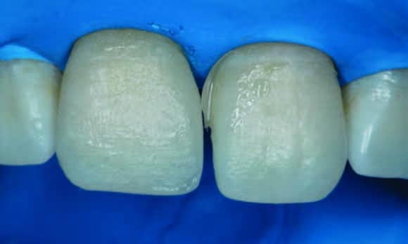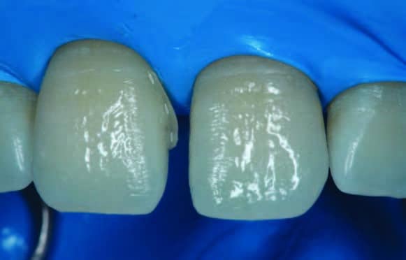 Toutes les incisives maxillaires sont isolées avec une digue en caoutchouc ; (Fig.3) ce qui assure un contrôle complet de l’humidité en gardant ainsi un secteur propre et sec. Il supprime aussi la papille, réduisant le triangle noir postopératoire. La surface de l’émail est minimalement préparée avec une fraise fissure diamantée pour augmenter la surface de liaison à l’émail ; (Fig.4).