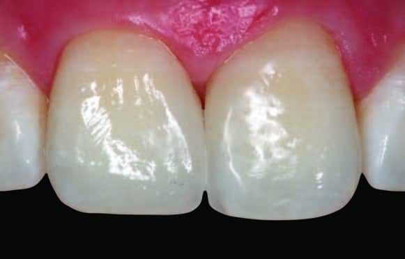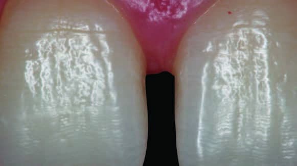 L’un des principaux défis auxquels sont confrontés les cliniciens lors de la fermeture des diastèmes antérieurs est la prévention ou l’élimination d’un triangle noir entre les dents. Le point-clé idéal pour recréer des papilles est de fournir une courbure cervicale qui repousse la limite cervicale et qui commence en zone sous-gingivale. On peut atteindre cette zone avec une bande de Mylar placée sous les limites gingivales et en utilisant un composite fluide à haute viscosité injecté à la zone du futur point de contact.
