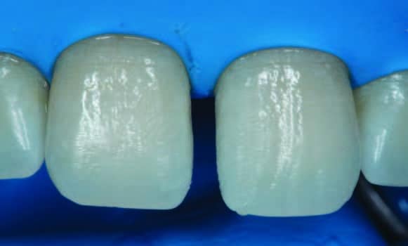 Ce « trottoir » de composite va créer le profil d’émergence idéal ; (Fig.8). La clé du succès dans les cas de diastème est de terminer la première dent complètement avant de commencer la deuxième ; (Fig.9), puis de procéder aux corrections de taille et de forme de la première dent de sorte que la taille finale des centrales soit la même à la fin du traitement ; (Fig.10).