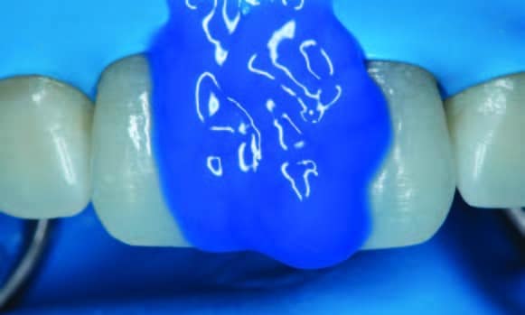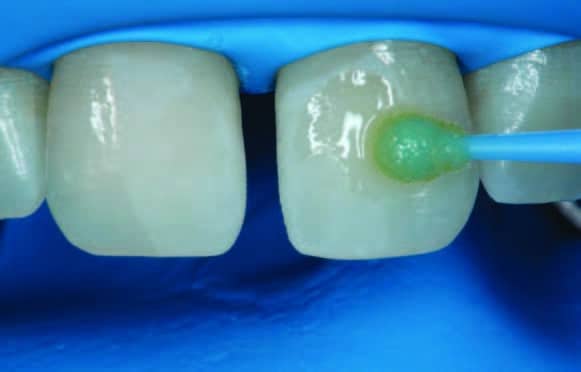 Un acide phosphorique à 37 % est appliqué sur la surface mésiale prête à être restaurée pendant 15 secondes. Puis on rince pendant 20 secondes ; (Fig.5) et on sèche avec de l’air tout doucement ; (Fig.6). Ensuite, un système adhésif à deux flacons est utilisé en plaçant d’abord le primer avec une brosse microbrush. On pratique des mouvements de frottage légers pendant environ 15 secondes, puis on sèche doucement avec de l’air pendant environ 5 secondes. À l’aide de la même brosse-applicateur, que l’on va tremper dans la solutionadhésive, on va appliquer l’adhésif surla surface d’émail préparée avec unmouvement de frottement léger pendant 15 secondes. On va ensuite souffler àla marge, ou en totalité si nécessaire,en utilisant une légère quantité d’air, puis on utilise une lampe à photopolymériser pour durcir l’adhésif pendant20 secondes ; (Fig.7).