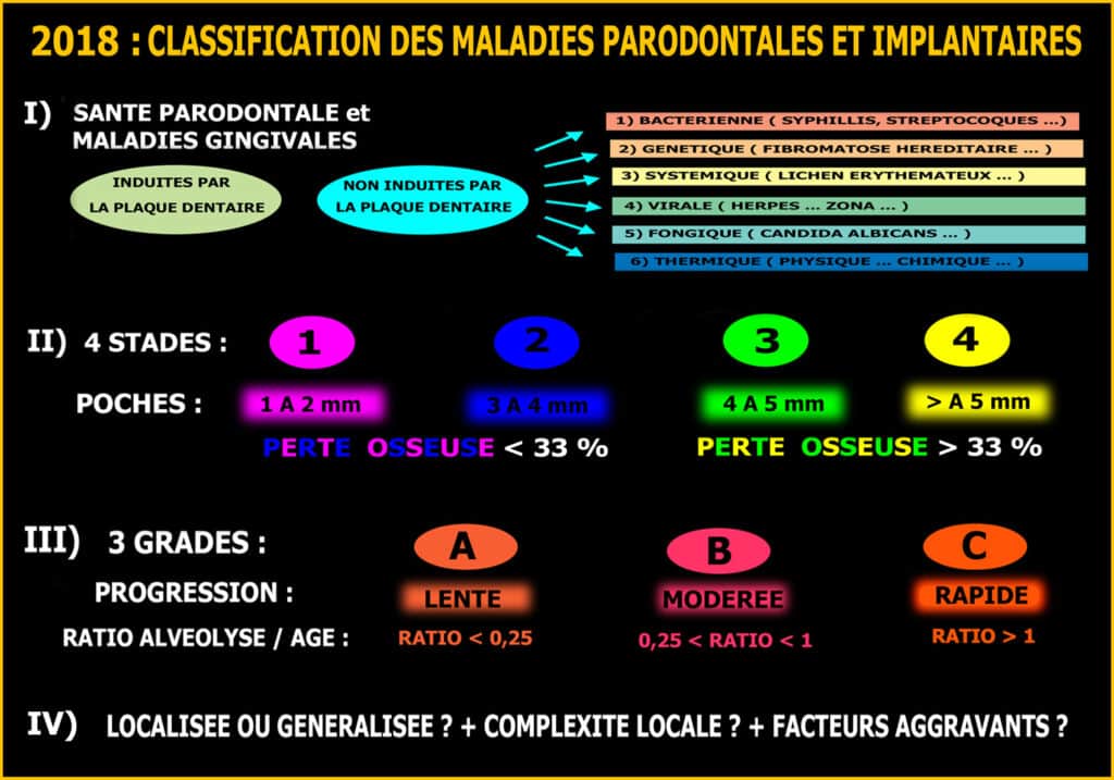 Cette nouvelle méthode différencie les parodontites induites par la plaque dentaire de celles non induites par la plaque dentaire (génétiques, virales, fongiques, etc.). Elle différencie ensuite 4 stades de poches osseuses et 3 grades de progression en étudiant le rapport alvéolyse/âge avant de tenir compte des facteurs aggravants et de l’étendue de la pathologie.