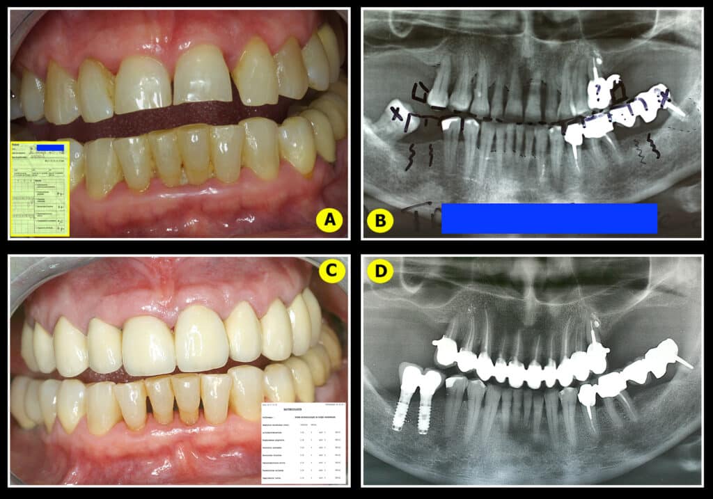 Fig.10C et D : Le résultat. Toutes les dents maxillaires ont été conservées, le traitement ayant permis une excellente régénération naturelle avec disparition des mobilités. La culture réalisée à l’époque (C) montre la disparition des pathogènes parodontaux. Un bridge esthétique a été réalisé pour satisfaire l’urgence du patient mais le secteur mandibulaire gauche doit être consolidé en priorité par la mise en place de 1 ou 2 implants au niveau 37.