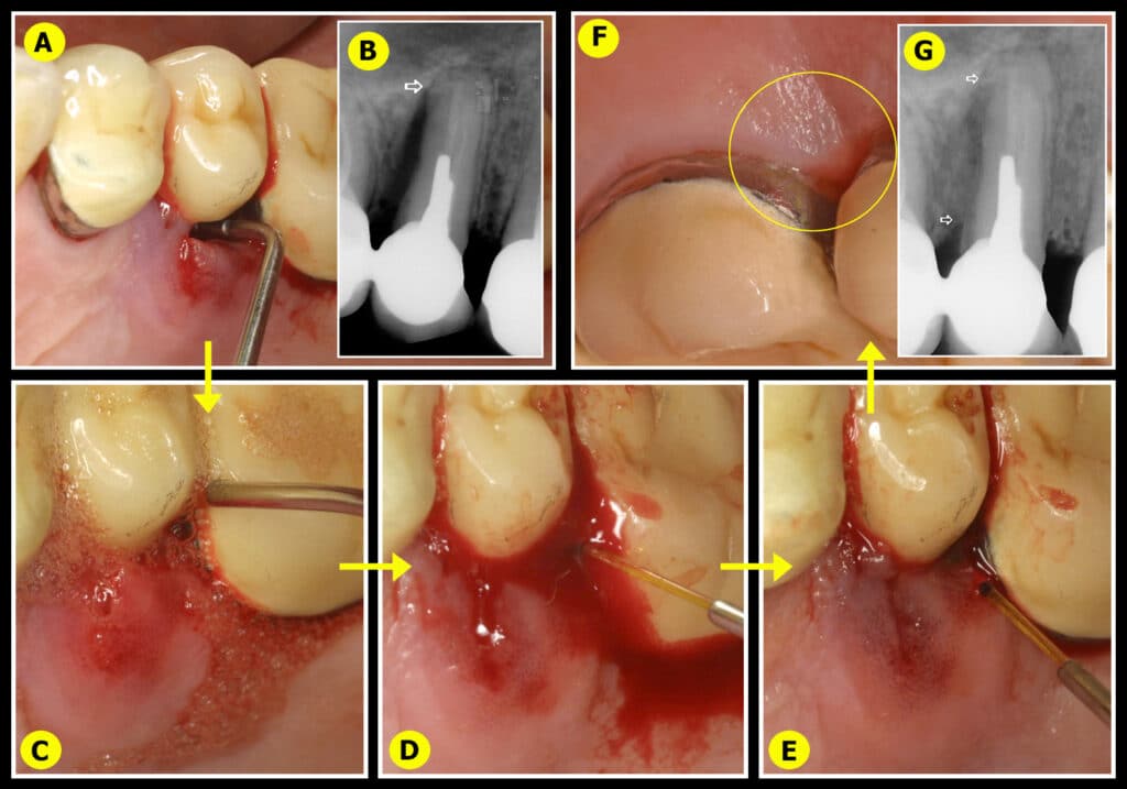 Deux exemples de furcation (Fig.11) et abcès parodontal (Fig.12) qui sont traités à l’aveugle suivant le même protocole que les 8 cas précédents avec décontamination, protection par simple caillot sanguin et hygiène bucco-dentaire quotidienne. Les résultats radiographiques montrent une excellente cicatrisation osseuse naturelle (Fig.11-E), (Fig.12-G) sans aucune régénération osseuse guidée par biomatériaux.