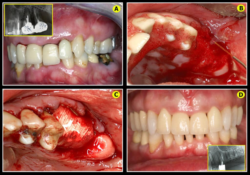 Dans le cas de la figure 14, le patient âgé de 48 ans est victime de plusieurs pathologies parodontales et endodontiques, et demande une reconstruction esthétique urgente pour raisons professionnelles. La tentative de conservation des molaires 26 et 27 n’est pas souhaitable car un échec mettrait en péril la reconstruction prothétique, mais également le peu de volume osseux encore disponible entre les apex des dents et le sinus maxillaire (Fig.14A- radio). L’extraction de ces deux molaires et la régénération osseuse nécessaire à l’implantologie envisagée peuvent se faire conjointement au traitement parodontal décontaminant, juste après celui-ci. Les dents sont extraites et le volume osseux résiduel, minutieusement cureté, est à nouveau décontaminé (Fig.14B) avec le même protocole assisté par laser Diode. Le sang oxygéné est laissé en place pour accueillir la greffe de comblement qui est protégée par des membranes (PRF + collagène) (Fig.14C) avant une fermeture des berges par points séparés et sans tension excessive pour laisser la meilleure circulation sanguine possible au niveau des berges gingivales. Le résultat (Fig.14D, radio) permet la mise en place d’implants de 11 mm. La décontamination laser assistée a permis de réaliser ces traitements parodontaux et chirurgicaux conjointement.