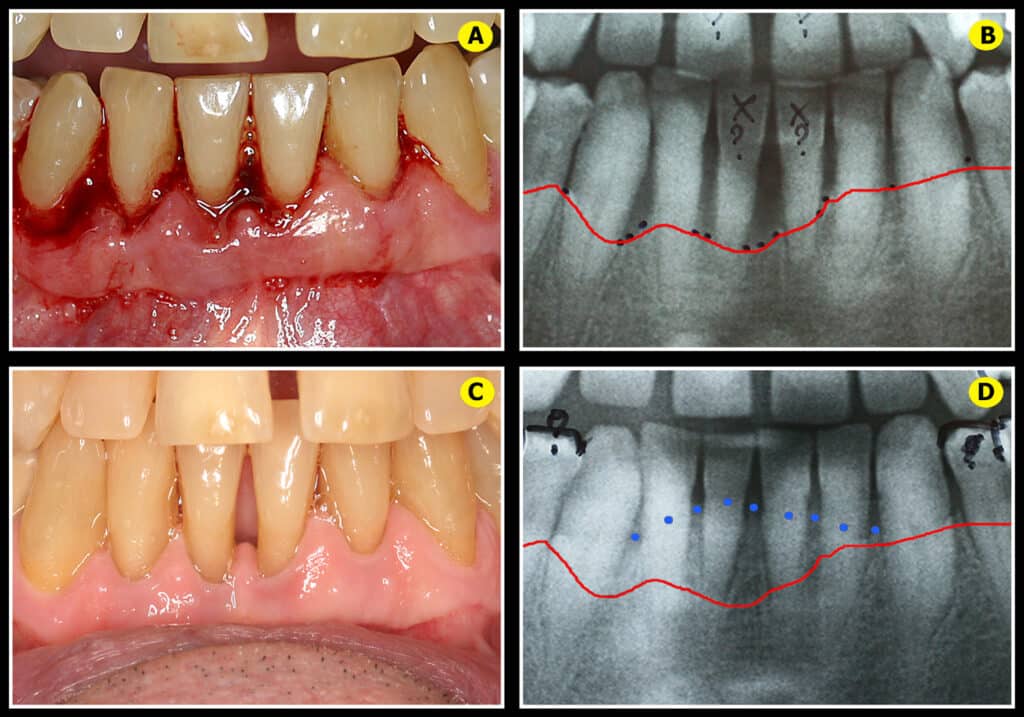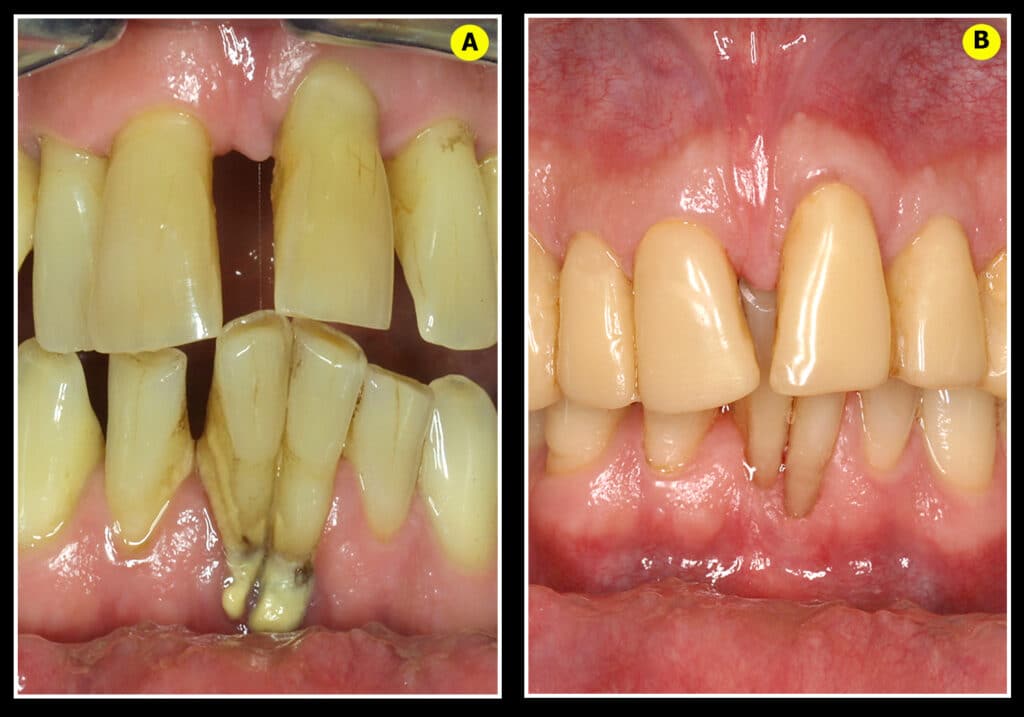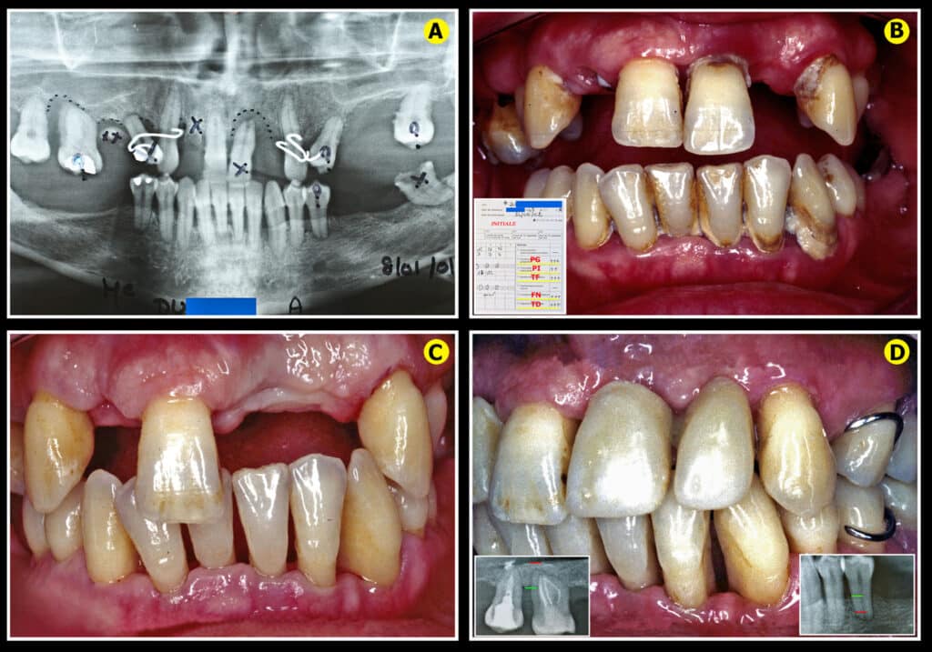 Le patient est adressé avec un plan de traitement d’extraction générale (31 extractions), plus une mise en place de 16 implants et 2 bridges complets. Il est décidé, dans un premier temps, d’effectuer une simple décontamination laser assisté accompagnée de l’hygiène bucco-dentaire quotidienne avant de prendre la décision d’un plan de traitement chirurgical. Le résultat obtenu à 18 mois postopératoires permet le maintien de toutes les dents maxillaires et mandibulaires avec une cicatrisation gingivale naturelle satisfaisante au niveau des incisives (Fig.7B). Une gencive protectrice dense est venue naturellement combler les récessions gingivales avec la disparition des mobilités et même un retour des vestibulo-versions incisives à une position plus esthétique sans aucun acte orthodontique ou prothétique.
