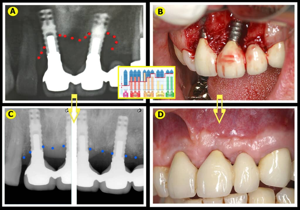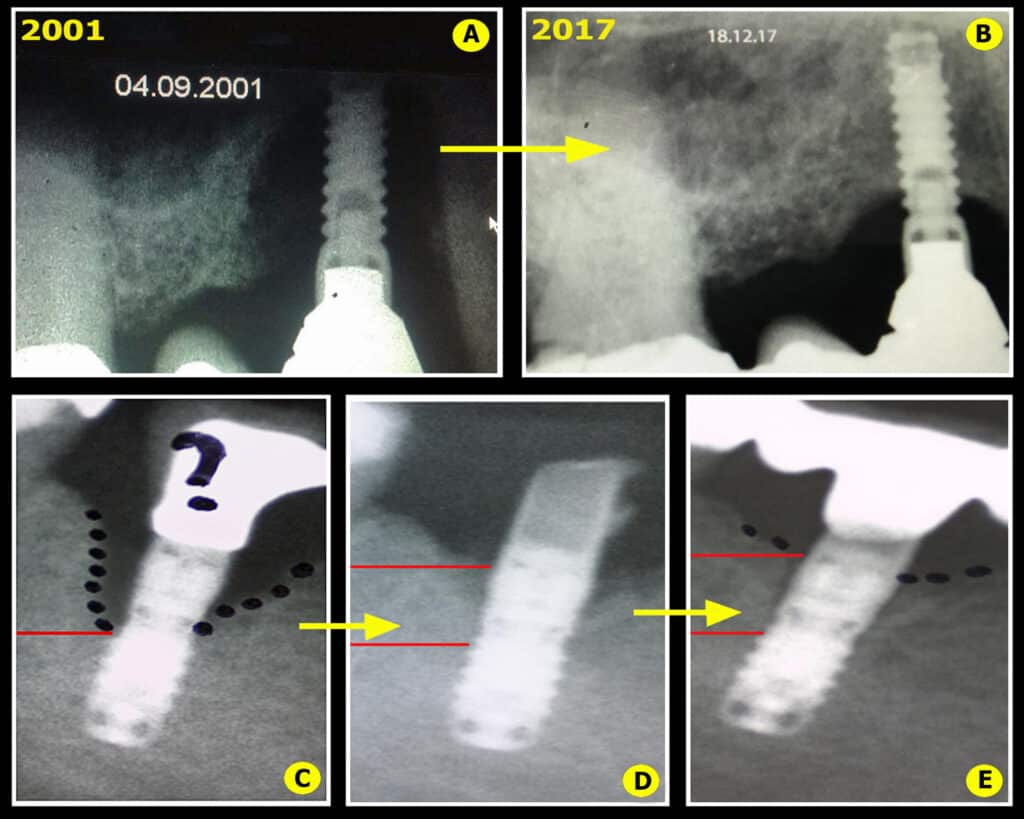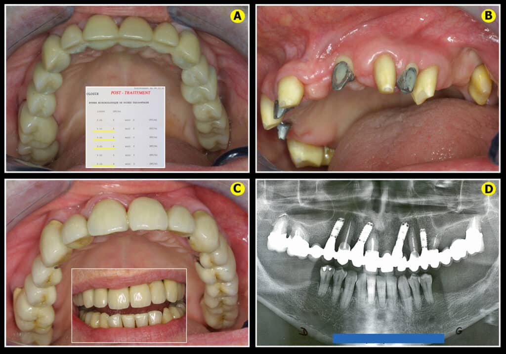 Ce type de cas clinique doit être surveillé régulièrement avec une maintenance parodontale lasers assistée rigoureusement suivie (qui sera décrite dans le prochain chapitre). La dernière radiographie de ce cas est à plus de 10 années postopératoires (Fig.16D) et montre une bonne stabilité du résultat avec ostéo-intégration des implants et des reconstructions osseuses autour des piliers naturels satisfaisantes dans ce contexte délicat.