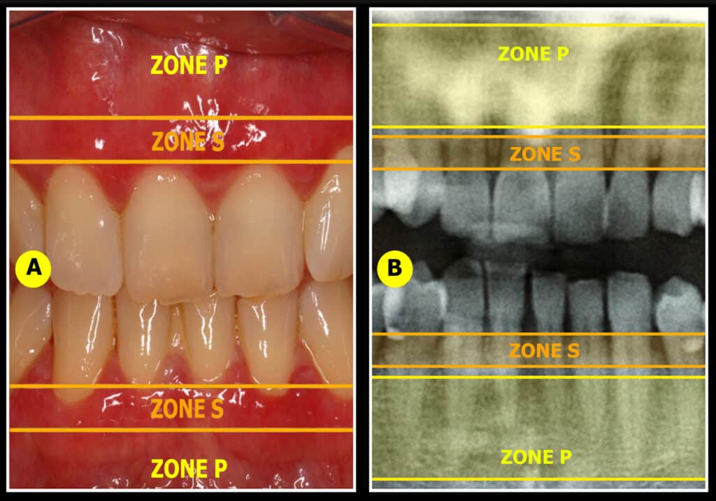 1) Comme cela est indiqué dans Dentoscope n°223 (Fig.4 et 5 – page 13), nous évaluons également les mobilités, et l’addition « perte de soutien osseux + mobilité » nous donne une bonne évaluation des chances de succès dent par dent.