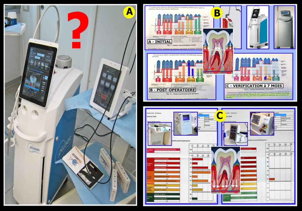 3) L’étude bactériologique est indispensable pour la précision du diagnostic et très utile pour le réglage des lasers (tests de laboratoire sur la fragilité et la résistance des bactéries parodonto-pathogènes). Elle permettra en plus une information médicale importante pour la santé générale de nos patients et un comparatif effectué à chaque maintenance (microscope à contraste de phase) autorisera un suivi précis de l’évolution de la flore parodontale et donc de l’hygiène bucco-dentaire réellement suivie quotidiennement.