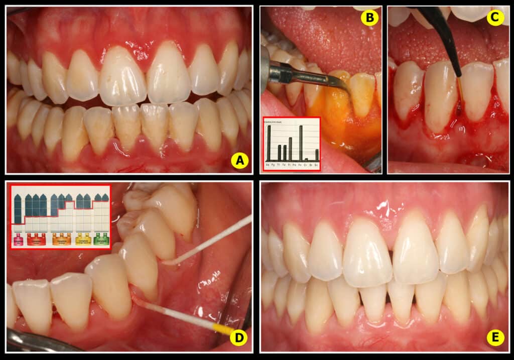 a) Traitement parodontal décontaminant lasers assisté et surveillance de l’hygiène bucco-dentaire (Fig.15C).