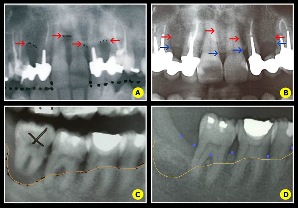– Pertes de soutien osseux de 50 % sur les incisives.